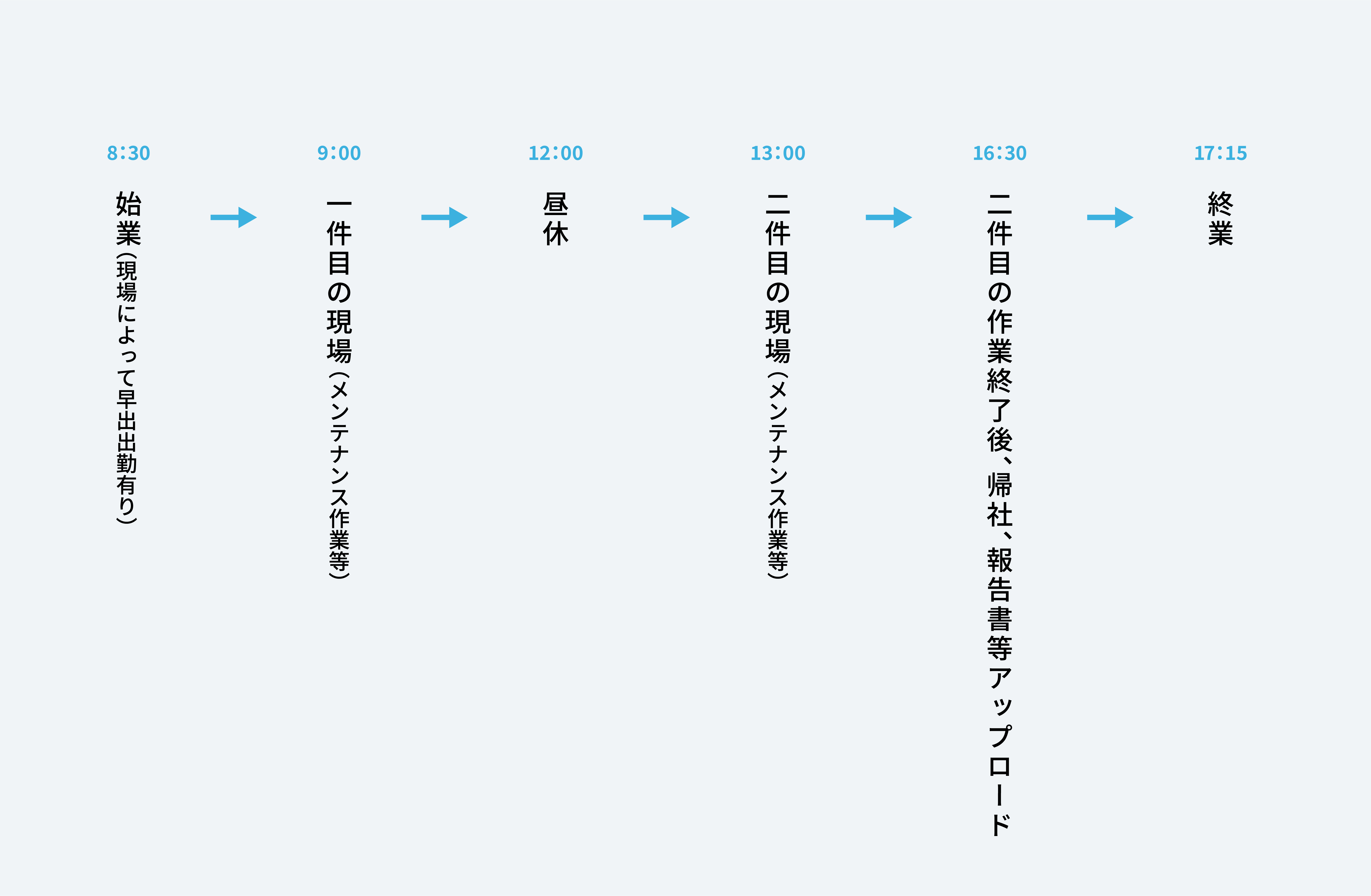 - 8:30〜17:15(休憩60分、月平均20時間程度残業あり)